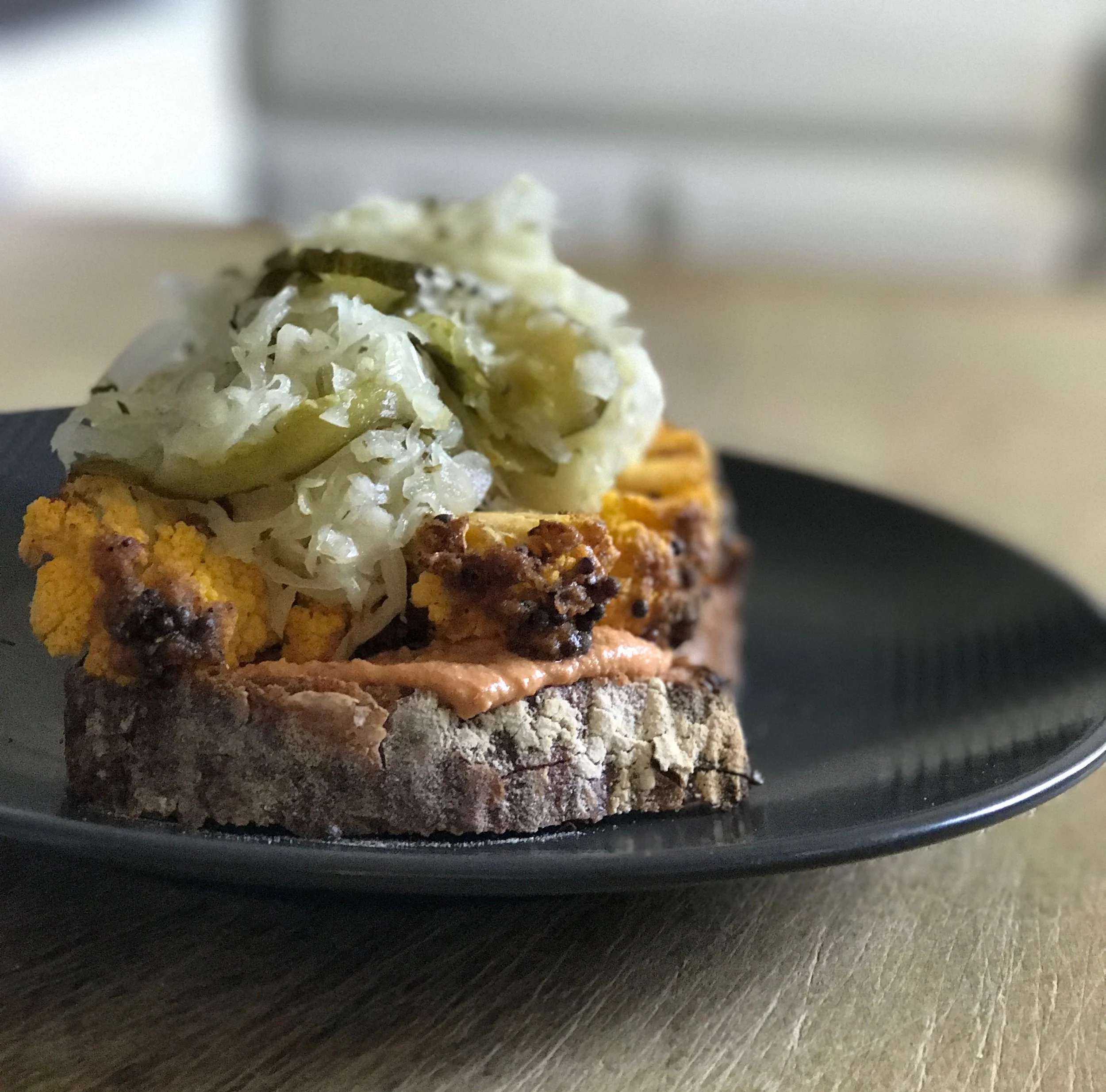 When your cauliflower is almost tender, place your bread in a toaster. Spread the dressing, place cauliflower, top with Farmhouse Culture Garlic Dill Pickle kraut and serve. Trust me, the Garlic Dill Pickle kraut is what makes this delicious so if you can find it in a grocery store near you buy it! A good rule to remember is that you never want to heat your kraut because it will kill off the good bacteria.